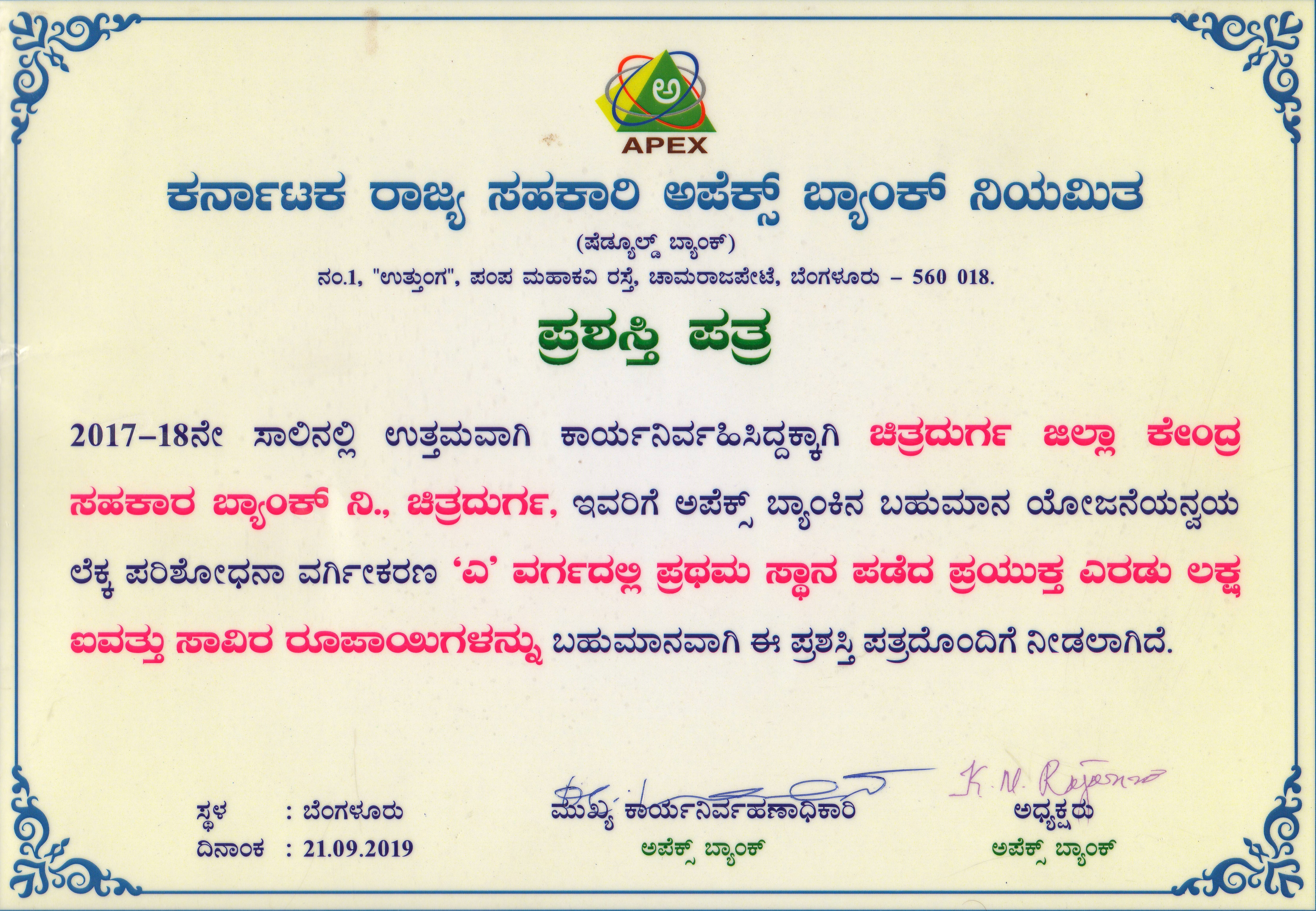 The Chitradurga District Co-Operative Central Bank Ltd., Chitradurga was established in the year 1955. The Bank was covering whole of the undivided district (Chitradurga & Davanagere) with 9 Taluks till 2002. After bifurcation, the area of operation of this Bank extends to the whole of the Chitradurga district with 6 taluks. Hiriyur taluk is having irrigation facilities and remaining 5 taluks are rain fed areas. The major crops of the District are Jowar, Cotton, Groundnut, Sunflower , Maize, etc., The Bank has totally 14 Branches of which 7 branches are located at Taluk Head Quarters and the remaining 7 in rural area. Farmers of the district are being financed through 157 Primary Agriculture Cooperative Societies ceded to this Bank